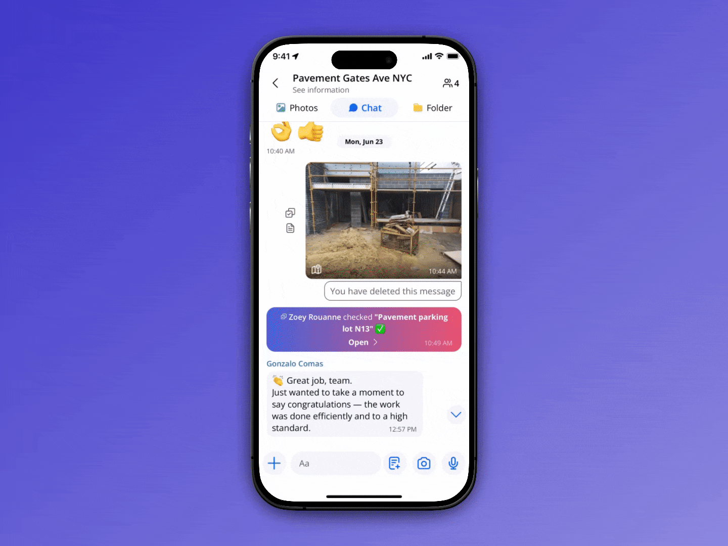 Chaque chantier dispose d'un groupe de discussion dédié. Toutes les photos, les documents, et les tâches sont centralisés en temps réel dans le fil de discussion, ce qui rend le suivi simple et organisé, et permet de ne rien oublier!